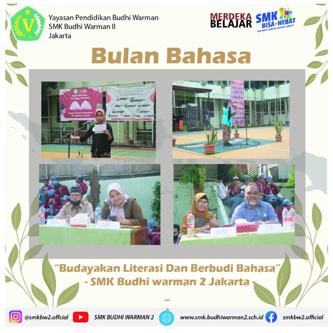 Kegiatan Bulan Bahasa adalah salah satu sarana untuk mengembangkan potensi dan meningkatkan kreativitas siswa/siswi di SMK Budhi Warman 2 serta menambah wawasan tentang pengetahuan berbahasa agar kita dapat lebih memahami dan mampu mengaplikasikan berbahasa yang baik dalam kehidupan sehari-hari. Mengusung tema “Meretas Literasi dan Berbudi Bahasa”, event Bulan Bahasa di SMK Budhi Warman 2 dilaksanakan dengan tujuan untuk meningkatkan motivasi siswa-siswi untuk menjadi pribadi yang berkualitas, melahirkan generasi penerus bangsa yang dapat membuahkan keberhasilan, serta meningkatkan potensi siswa dalam kemampuan berbahasa yang baik dan benar.